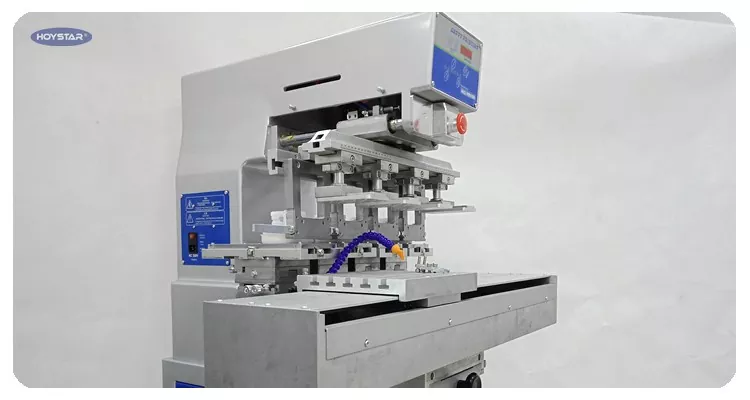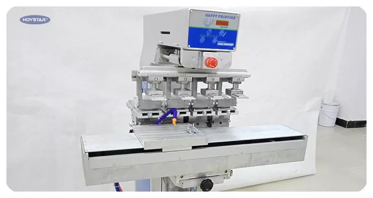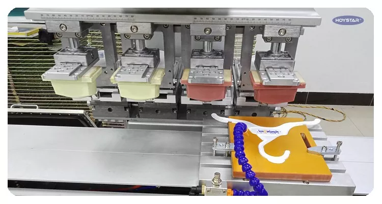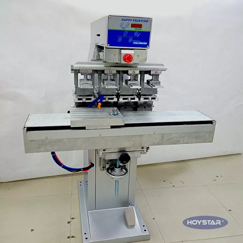 স্টপিং শাটল ওয়ার্কটেবল এবং 4টি প্রিন্টিং হেড সহ 4 রঙের প্যাড প্রিন্টিং মেশিন, মেশিনটি চারটি মাথা সহ 1 রঙের প্যাড প্রিন্টার হিসাবে ব্যবহার করা যেতে পারে।