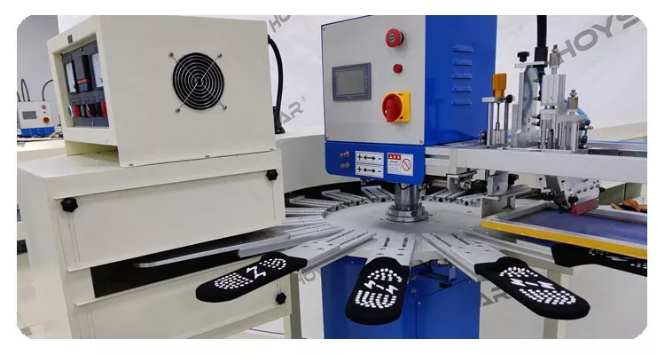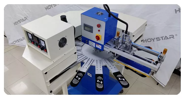 চীনে পেশাদার প্রস্তুতকারক হিসাবে, আমরা আপনাকে উচ্চ দ্রুত HOYSTAR বড় আকারের মোজা সিল্ক স্ক্রিন প্রিন্টিং মেশিন সরবরাহ করতে চাই। এটি উচ্চ-ভলিউম উত্পাদনের জন্য উপযুক্ত 16টি ওয়ার্কস্টেশন মেশিনের সাথে আসে। এতে উন্নত PLC এবং টাচ স্ক্রিন কন্ট্রোল মোজার সোল এবং হিল প্রিন্ট করতে পারে। একটি সমন্বিত IR শুকানোর টানেল সিলিকন এবং কালি কার্যকরীভাবে শুকানো নিশ্চিত করে